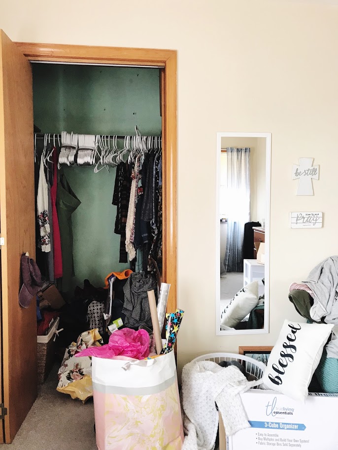 Here’s the [very embarrassing] before picture. I actually forgot to take a before picture and this is it after I pulled a few things out and into the floor space in front of the closet. So an almost-before picture.