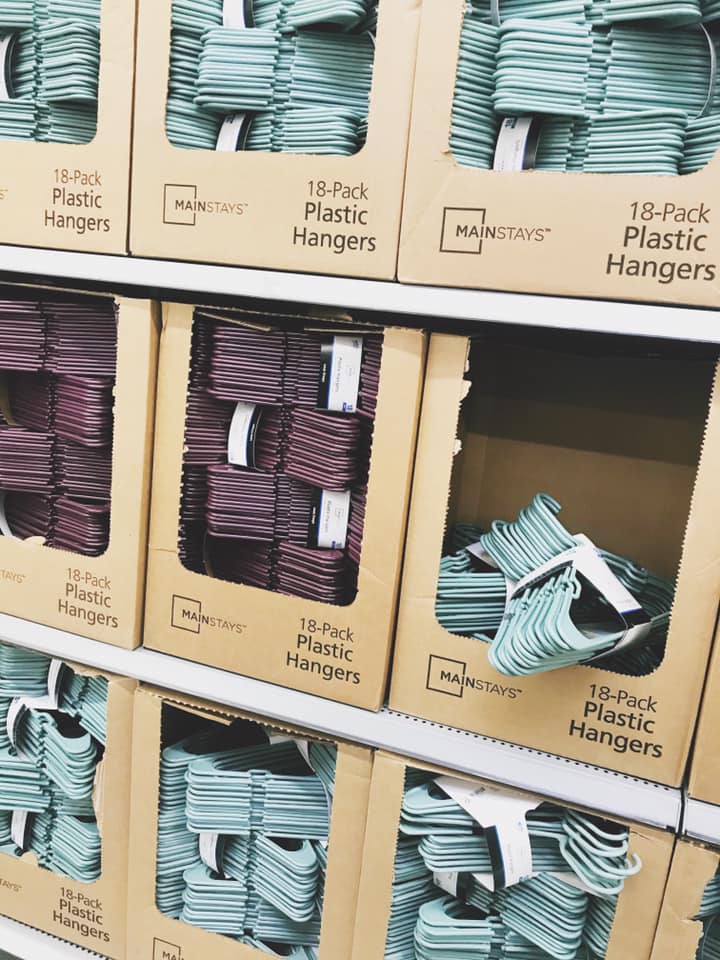 You can tell I was already planning to do SOMETHING with my closet space – because I’d already purchased my favorite inexpensive hangers when I moved into my rental. The neurotic part of me that craves order and gets excited about color-coding desperately wanted all matching hangers, and I found these plastic hangers in white from Walmart in a pack of 18 for under $2. I bought like 4-5 packs. (If you’re looking on Walmart’s app for them, they’re the store brand, Mainstays. They also make them in children’s clothing sizes.)