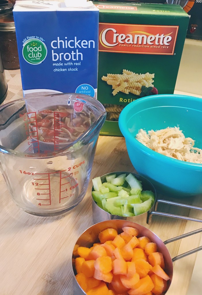 Near the end of your four hours, go ahead and chop your carrots and celery and measure out your noodles and your broth.