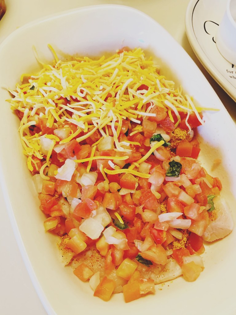 Sprinkle the pico de gallo over the chicken evenly. It should cover almost all, if not all, of the chicken. Then, you’ll want to sprinkle cheese on the top, covering it again.