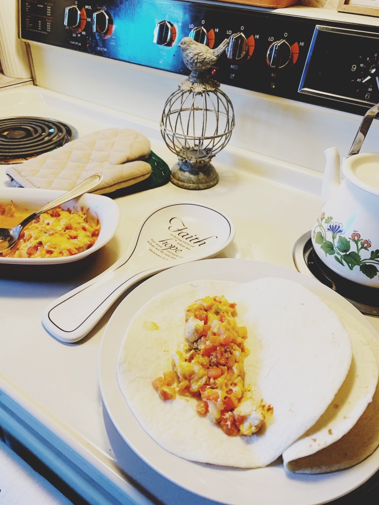 Bake the dish for 28-30 minutes at 375F. Upon removing the dish, serve with tortillas, rice, and/or tortilla chips. I’m counting calories while I’m doing a workout and wellness challenge, and it was only about 600 calories for dinner with just the 2 tortillas full. Of course, my Mexican-food cravings would be WAY more satisfied if I’d paired this with chips and queso!