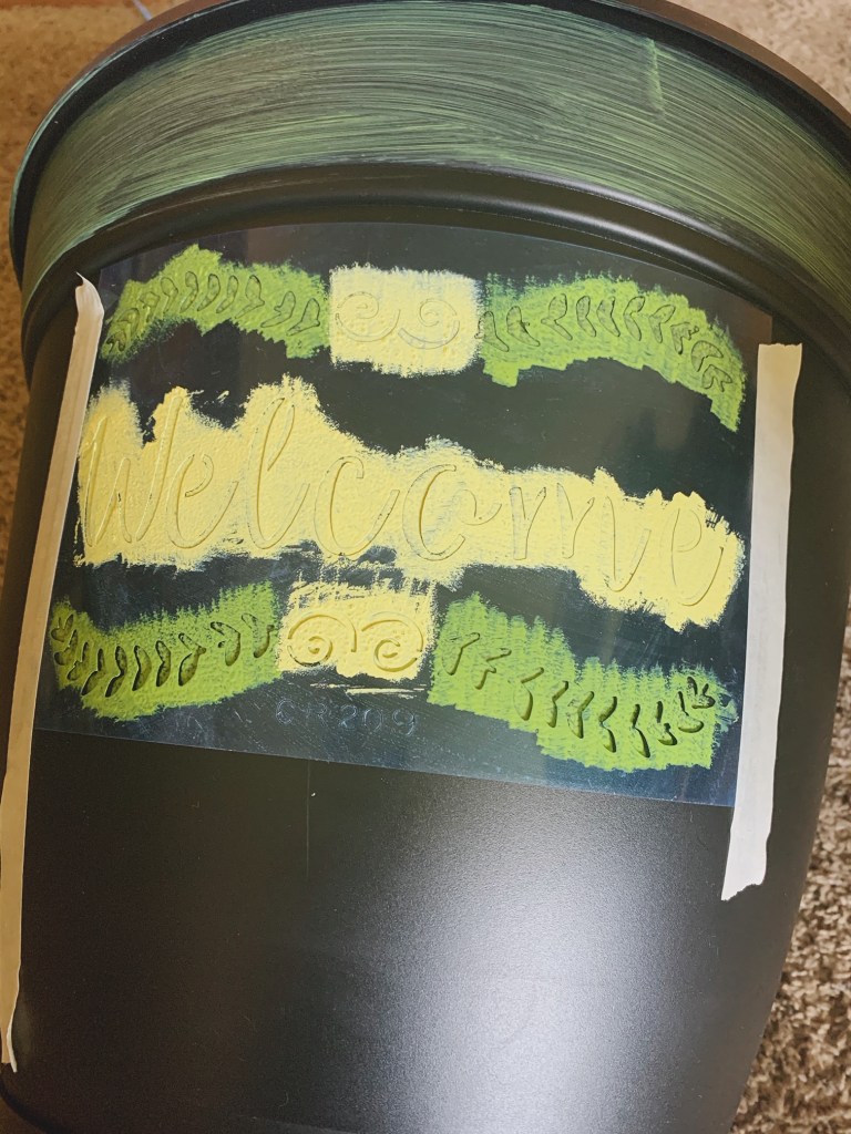 After the stripe was done drying, I used the same stencil on the largest of the pots. Because the pots are rounded, it is a little harder to position the stencil on their surface. I laid the pot down, so I could paint from above, and used the lip of the pot as my straight-edge guide to position the stencil. I did have to use extra tape and tape it down pretty securely. I used the same tapping method to paint on this stencil.