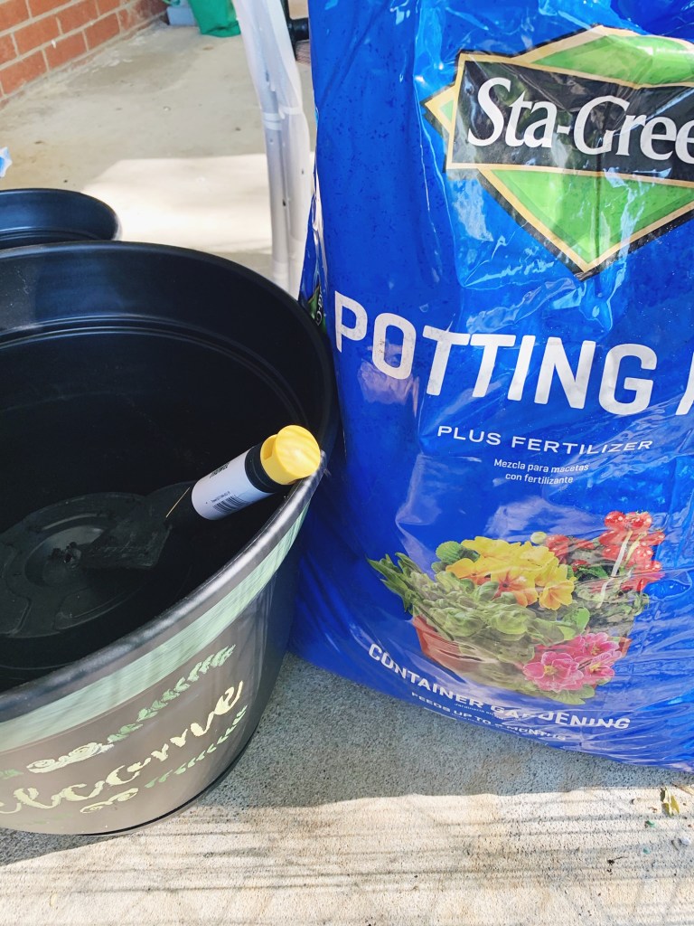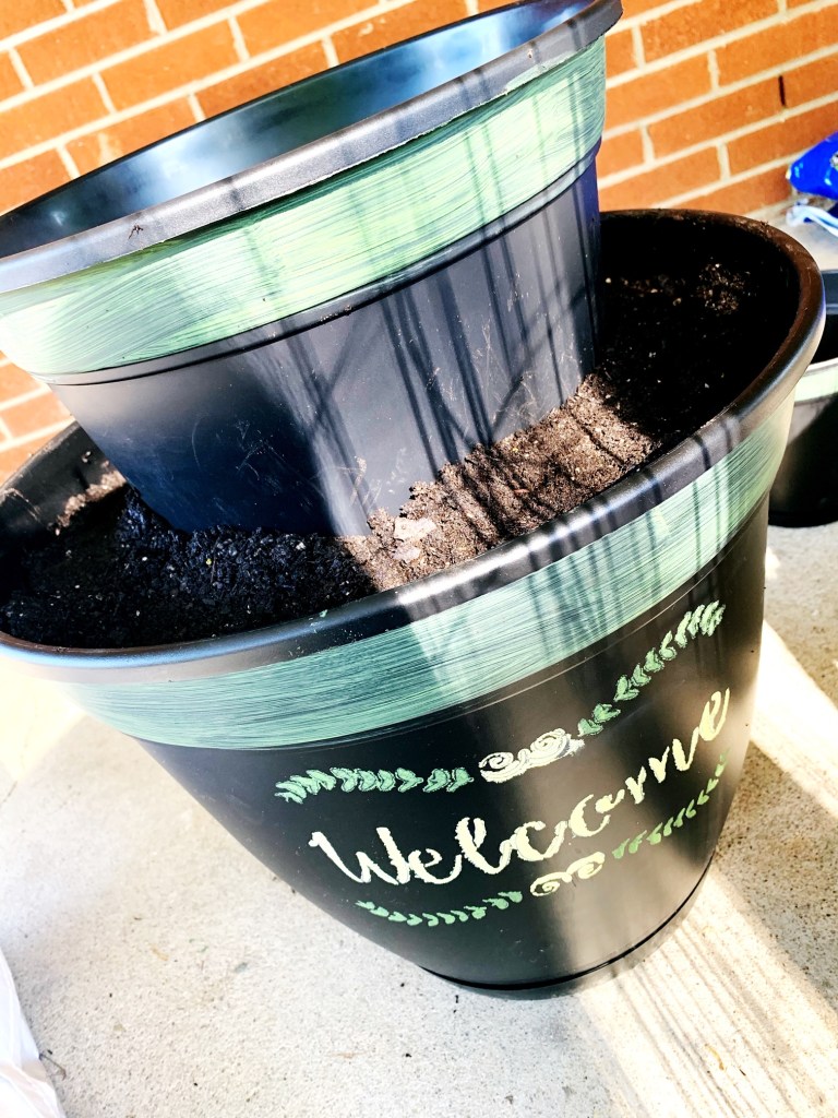 Once I was confident that everything was dry, I took the pots outside. Before filling the largest, I filled the small-medium one with dirt and flipped it upside down in the bottom of the largest pot; this became the base on which the next pot (the medium sized one) would sit. Before placing the medium pot, I began filling in with dirt around the base stacking pot. I did tap down the dirt several times to try and make a sturdy hold around the base pot. When stacking the medium one, I waited to plant until it was positioned – including using the small, non-painted pot, filled and upside down, inside as the base for the final small, painted pot.