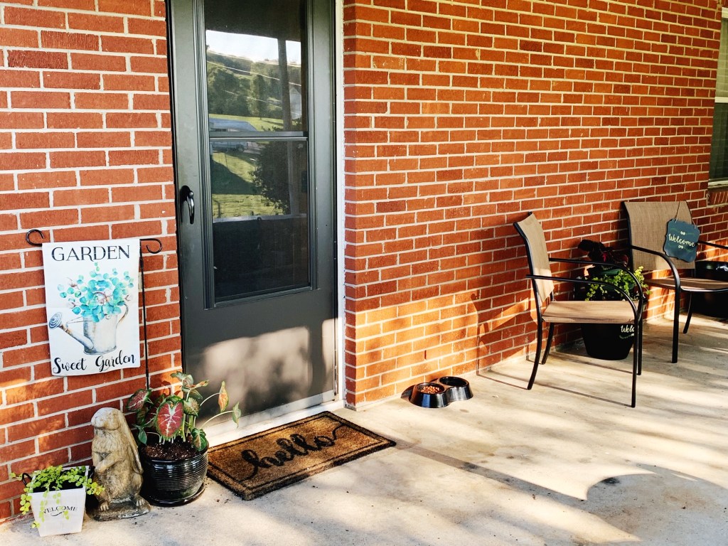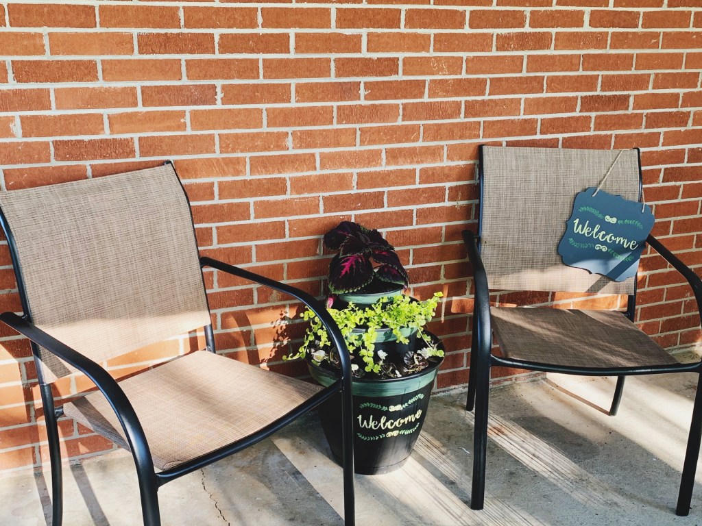 I placed these on the right side of my door with the matching sign and two outdoor chairs. These chairs were under $20 each at Lowes, by the way, so they were a deal for sure. The entire project, counting the dirt and plants used for this specific seating area cost under $100 – and that’s rounding up. So it can be done affordably if you’re just looking for a one-day project.