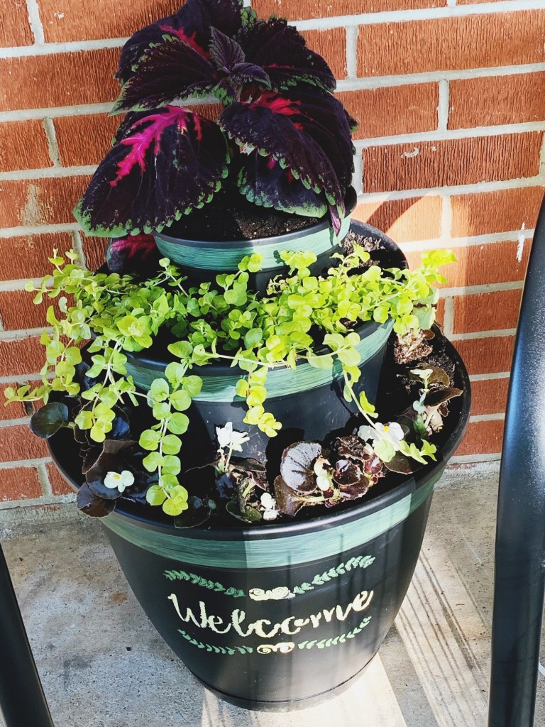 Because my carport is covered and away from direct sunlight, I chose shade-loving plants. Begonias, creeping jenny vines, and coleus each have a layer in my final stacked planting ensemble.