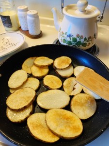 Drizzle a small amount of olive oil into a large skillet on a high heat (think 8-9 out of 10). Then, as it heats up, slice your potatoes into 2 centimeter-ish slices. Put the sliced potatoes in the hot olive oil and fry them up, flipping as they cook.