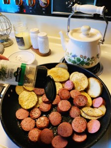 When the potatoes are golden, add in your turkey kielbasa, sliced into 3/4-1 inch thick slices. Add a little more olive oil as needed. These should be flipped as they cook as well, although I like a little browning on the meat personally. As the meat browns a little, I like to sprinkle in some Italian seasoning. (If you’ve been hanging around my recipes before, you’ve probably noticed that I’m a huge fan of Italian seasonings in my dishes.)