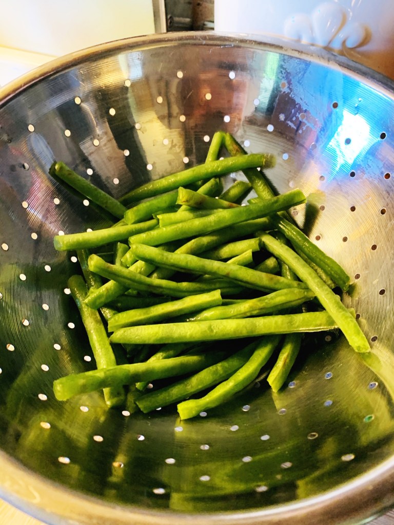 Let’s start by washing our produce! Scrub the dirt off of your potatoes. Then, snap your fresh green beans, by cutting off the ends, and rinse them in a colander.