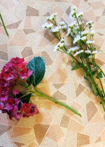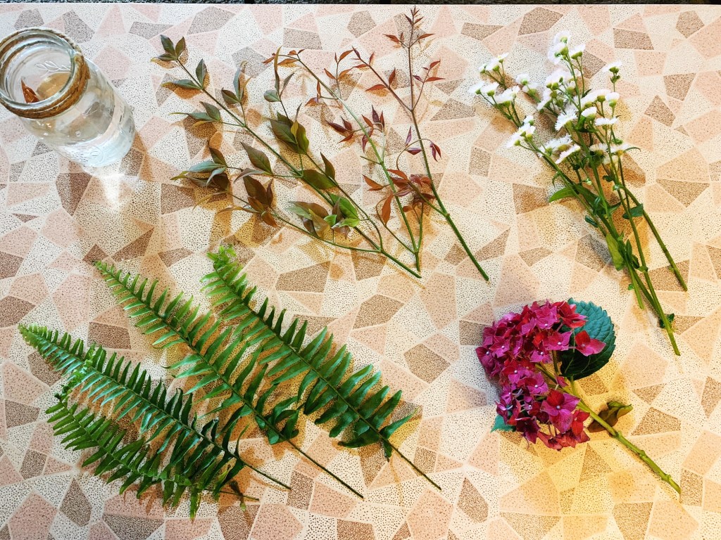 Once you have everything you think you’ll need (and I’d advise clipping a few extras of the greenery just in case), find a flat clear surface to lay everything out on. I have a bar between my kitchen and living-and-dining room space, and I use that countertopped bar for tasks like this often.