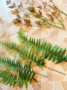 You can see that I’ve chosen some stems of fern and some reddish new stems from a nandina shrub – these will be what I’d call my “back drop” stems.