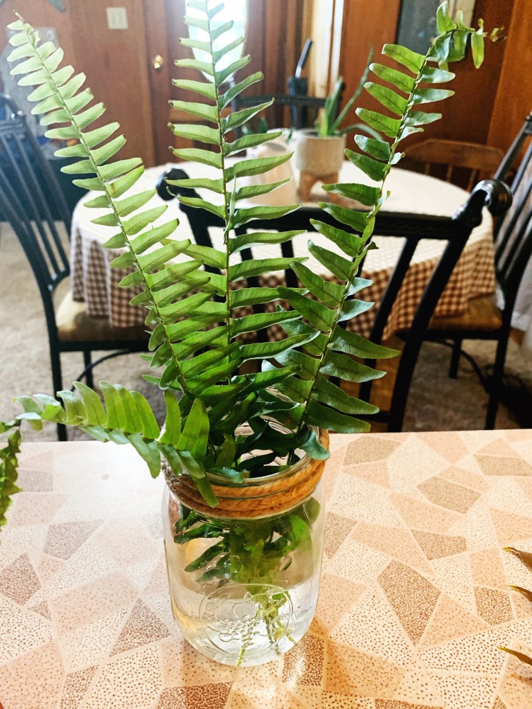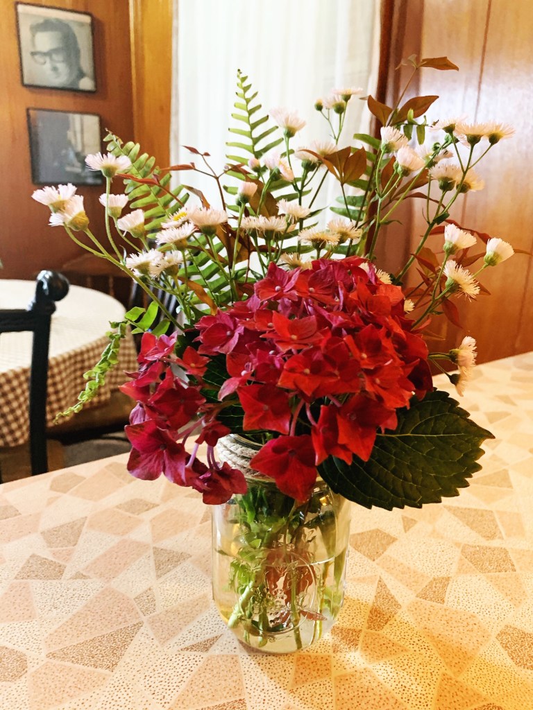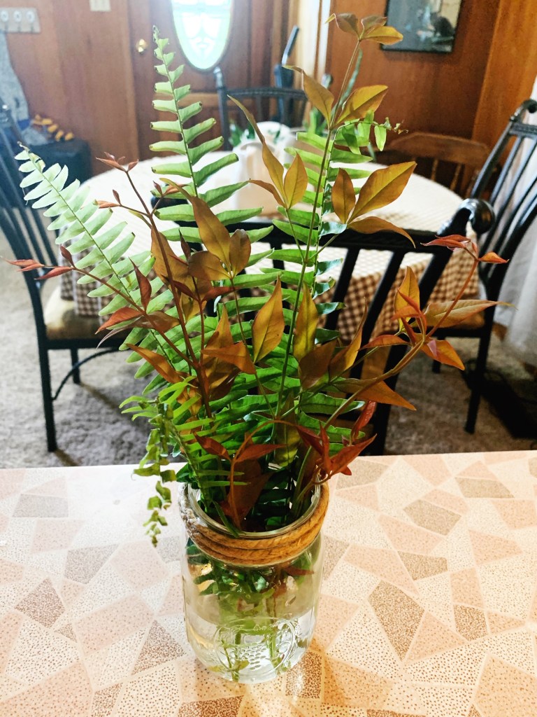 I’ll go ahead and arrange the ferns and the nandina stems across the back of the mason jar (or, if you prefer, vase) first. Then you’ll see that I added in the fleabane, then the hydrangea last to complete the arrangement.