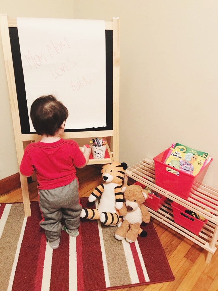 My little guy LOVES crayons, stamps, and markers! We have a LOT of art supplies (even a full art corner in his room, see below), and we love creating together (check out this list of DIY items we did for Mother’s Day).