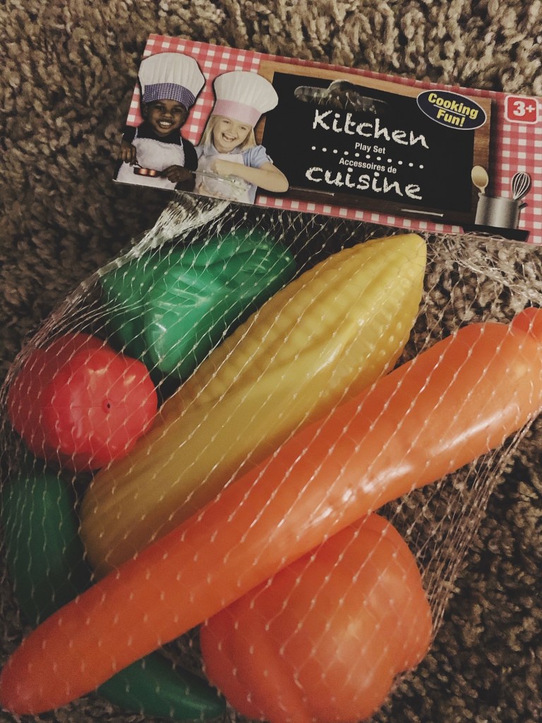 There were a few kid-sized plastic pots and a few plastic food items left with the play kitchen, but I wanted to make sure I was helping to further foster this interest. I started looking up play food – and that stuff can get expensive with toy retailers and big box stores! I was at Dollar Tree in the card aisle (y’all should seriously get your cards there – 2 for $1 and they have name-brand options), and I turned to see the toy section behind me. I was SO surprised to find play food and utensils! You can get a bag of plastic vegetables, fruit, or utensils for just $1 each! This is a huge savings compared to larger retailers, and my little guy has had so much fun with these!