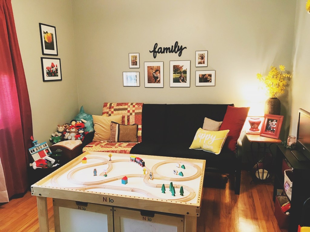 My rental belonged to a woman who had several grandchildren, and she had designated one room as a playroom. I have since done the same – designating that same room as my little man’s playroom (complete with a futon in case it also needs to act as a guest room in the future). In that room, there was a kid’s play kitchen that my landlords offered to leave for my little one to use – and boy, does he use it! He plays with the kitchen nearly daily, and he loves to pretend to make coffee, to bake cookies, and to mash potatoes. He really has taken hints from all that the grown ups in his life do and wants to mimic those actions, and it’s really neat to see him play “house” in his own way.