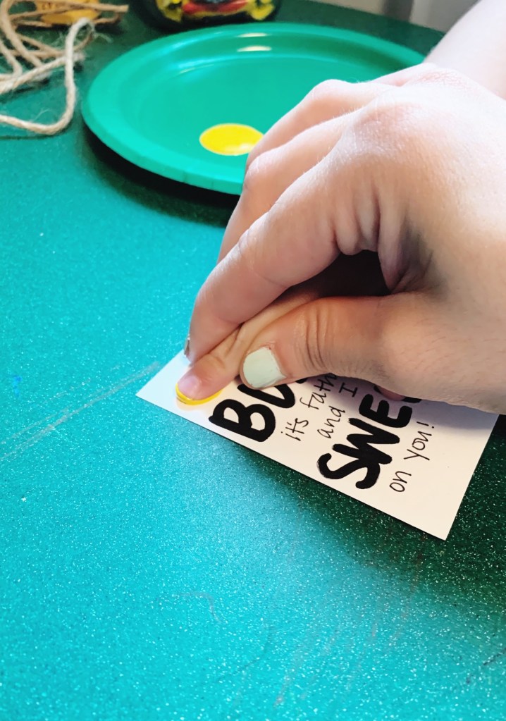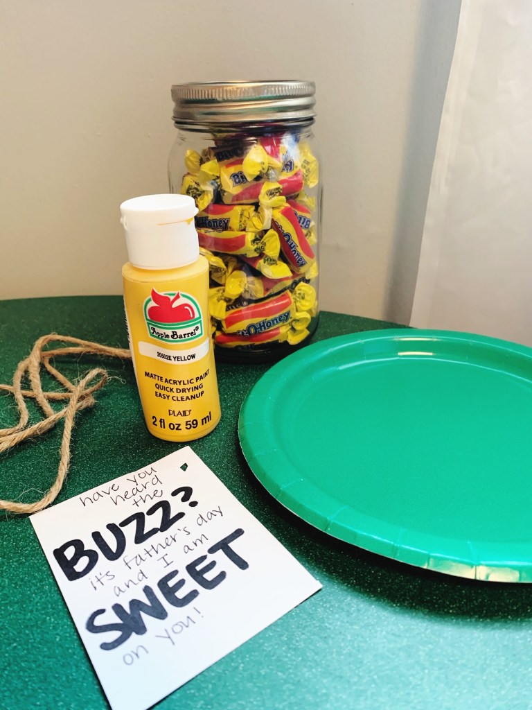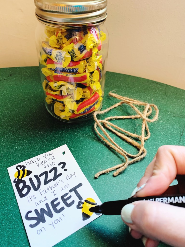 Next, on the cardstock, I pre-wrote a message that correlated with the candy: “Have you heard the buzz? It’s Father’s Day, and I am sweet on you!” I then dunked my toddler’s index finger in yellow paint and make two yellow fingerprints in open areas on the card. After letting them dry, I used black marker to turn them into little (and imperfect) bumblebees. I punched a hole in the corner of the card, used the twine to fasten it onto the jar with a simple bow.