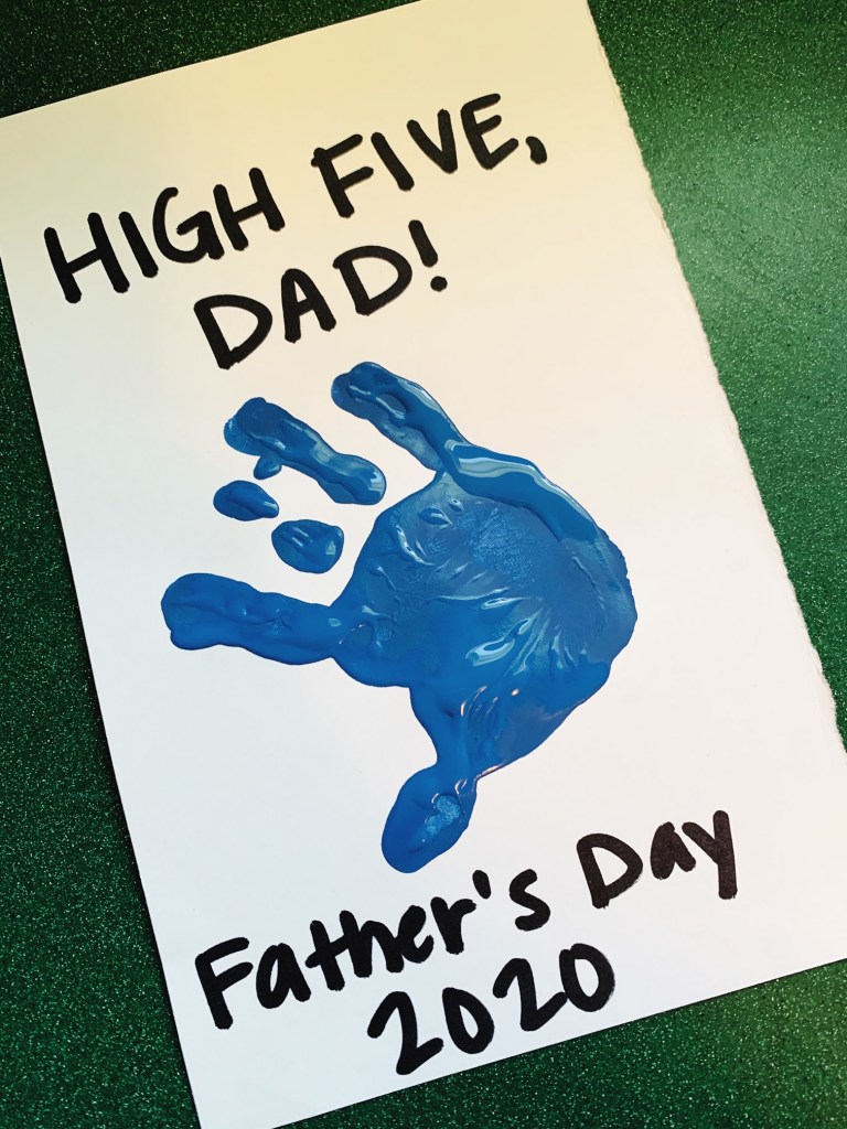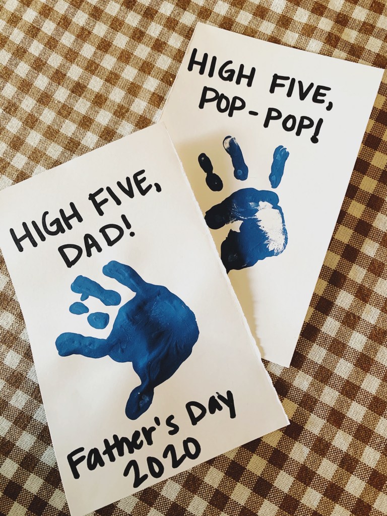 After you have the handprint done, you’ll want to wash that hand off quickly (yikes) and then write your message in marker or crayon. I opted for “High Five, Dad” and “High Five, Pop-Pop” because my two year old is counting now, and I thought that was a neat thing to capture in this piece along with his current handprint size. I’m sure there a ton of other cute phrases you can use, like “Hands down, you’re the best Grandpa” or something similar.