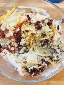 As your bacon heats, go ahead and stir your ranch seasoning packet into the sour cream. Mix in the ranch seasoning, then add in most of your reheated bacon bits and most of the cheese, saving a few larger pieces of bacon bit and some shredded cheese for the top – presentation is everything!