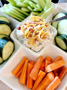 If you are tired of being asked to bring napkins or ice to weekend cookouts or family holidays, I have the perfect solution for you! My cheesy bacon ranch dip and a fresh veggie tray are the absolute perfect way to impress without needing too many ingredients or too many kitchen skills!