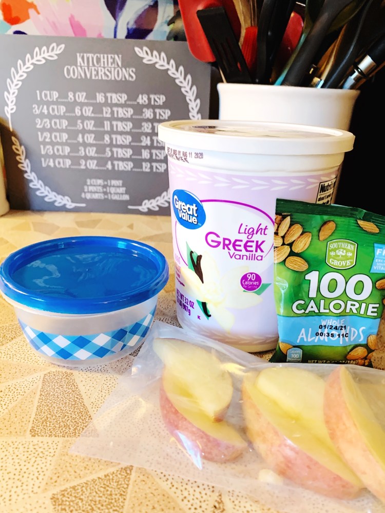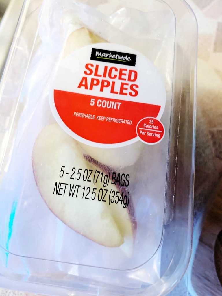 I also use the pre-packaged, sliced apples from Walmart. A medium sized apple will work, especially if you have an apple corer and slicer handy, but I’m packing two lunches most days, and it makes it WAY faster if it’s pre-cut and portioned for me.