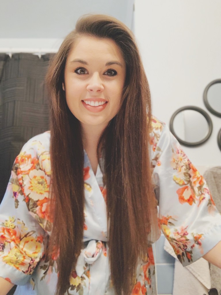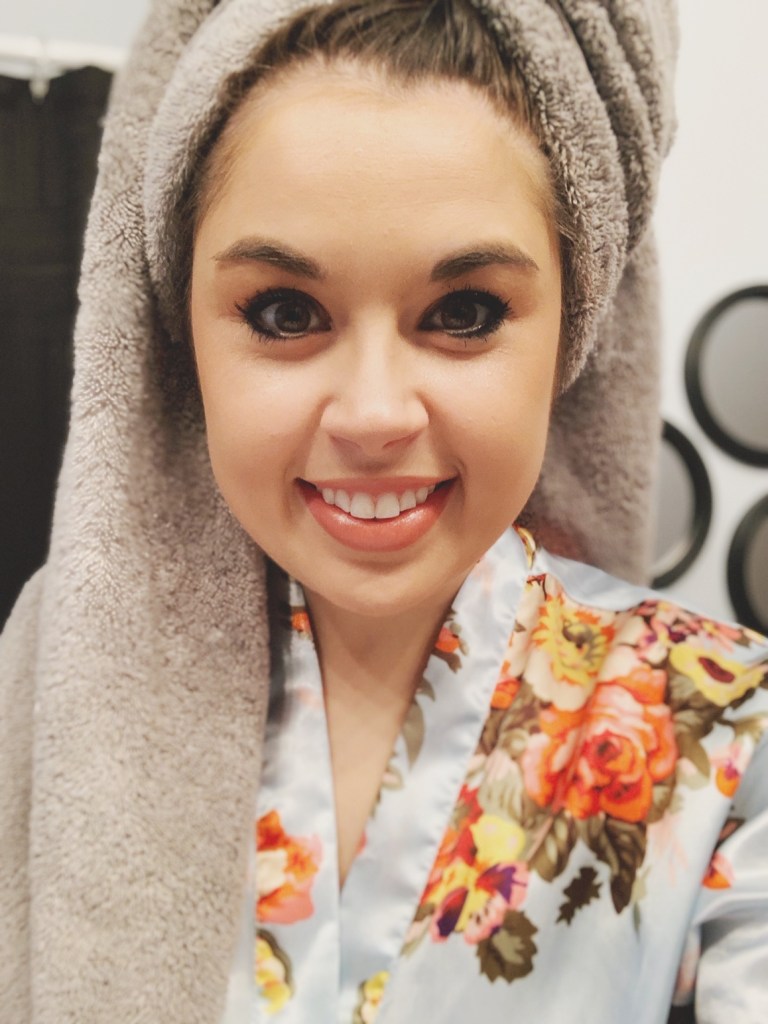 After my shower, I let my hair towel dry. If I’m doing this in the morning, like I was this day, I let it towel dry while I do my makeup. If it’s in the evening, I’ll let it towel dry while I fold laundry, run the vacuum, work on a graduate school assignment or reading, or watch an episode of a sitcom. It really only needs to towel dry for like 20-30 minutes, since I always blow dry it too.