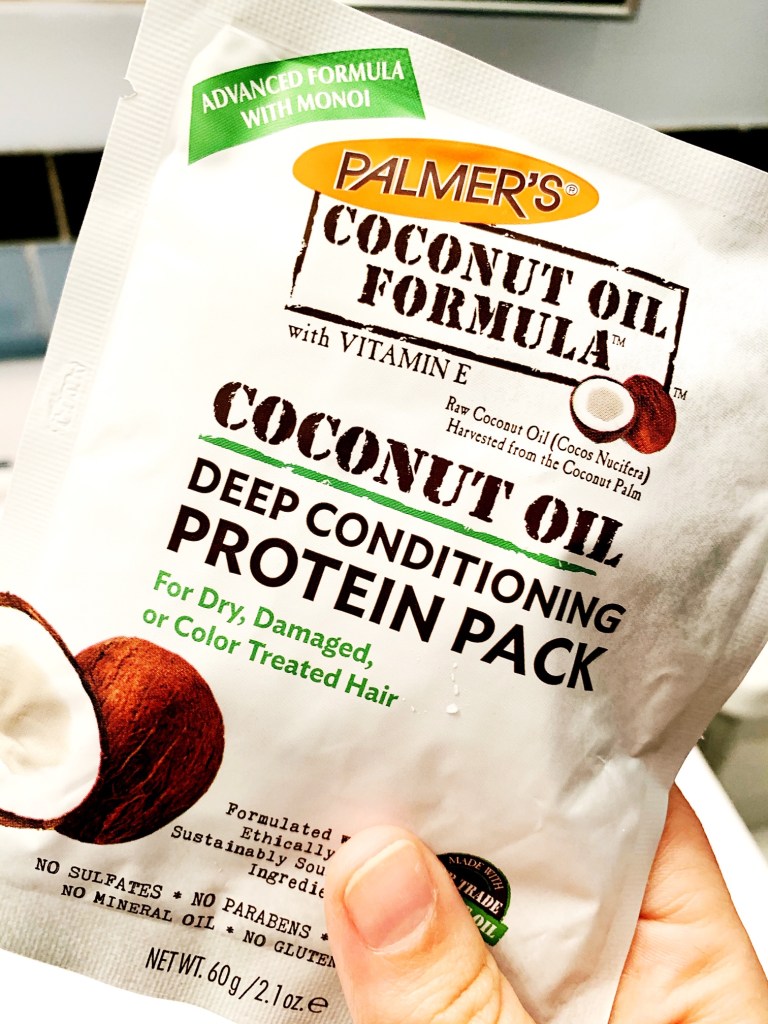 I’ve used a lot of different conditioner packets, and my all-time favorite is Palmer’s Coconut Oil Deep Conditioning Protein Pack. I can usually get 2 uses out of a packet, and with my long and thick hair, I think that’s pretty impressive. First, I suds up my entire scalp with the Aussie Miracle Volume Shampoo and wash like normal. Then, I only apply the Palmer’s Conditioner to the bottom half of my hair, so about earlobes down. I let this sit, then rinse it out after about 10-15 minutes. My hair immediately feels silkier and smells AMAZING.