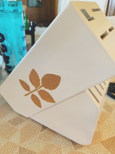 I decided to keep an eye out for an empty and used wooden knife block. While thrifting with my mom and sister one weekend recently (with masks and sanitizer and on a weekend when my son was staying with his father), I found one! It was $4.99, and it was at a KARM (Knox Area Rescue Mission) thrift store.