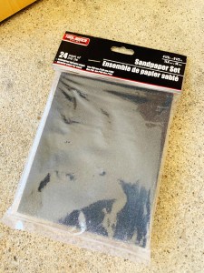 I also purchased sandpaper – I bought a pack of small sheets at Dollar Tree, actually, and a can of spray paint at Rural King in Heirloom White. I really do like the Rust-oleum brand of spray paint for any project – it’s just really durable for indoor or outdoor use.