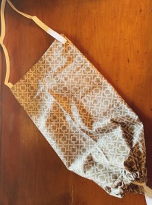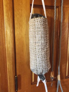 I don’t use these bags as fast as I end up collecting them, and a bag full of bags is ugly in the kitchen hanging on a hook or doorknob, so I decided to get crafty!