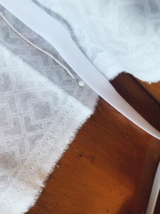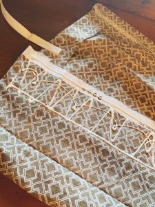 At the folded end at the bottom, I went ahead and tucked in one long piece of the white ribbon tape. It nestled perfectly into the crease. Above where the ribbon tape laid in the crease, I drew a thin line of Liquid Stitch. Then, I folded the fabric back and pressed the Liquid Stitch into place. This created a pocket for that ribbon tape, which can (when dry) become a pull-able and tie-able end.