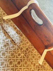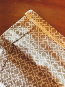 The first thing I did was cut my fabric yard in half. Then that half got folded evenly to double up the fabric. I laid out my now square of fabric to have the folded end closest to me as the bottom and frayed but matched ends at the top. Because I folded in half, I have the pattern facing the inside (facing up) and outside (facing down on the table top).