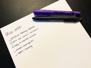 The particulars of your to-do list don’t matter. If you like color coding in your printed daily planner, great. If you like using the calendar app on your phone, awesome. If you simply have a yellow legal pad with your to do list jotted down in sharpie, that’s fine too. If a white board is up in your office, go for it. Whatever works for you, that is systematic and easy to replicate each time you start a new day or week, is what you should continue doing.