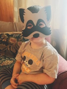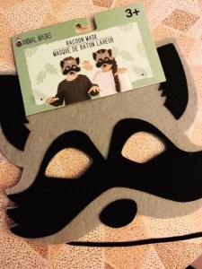 I found felt animal masks at my local Dollar Tree – and this little racoon was PERFECT for my little one! He had a ball trying it on and saying he was “playing pretend.”