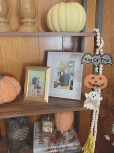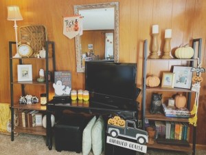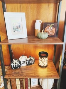 The hanging wooden bat, pumpkin, and ghost décor was a Walmart find. The wood block pumpkin and the three black and white pumpkins were each found at Dollar General.