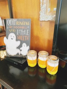 You can see my step-by-step tutorial for my candy-corn jar lanterns here. I found the “haunted house” truck stand at Big Lots for about $14-15 – I’ll eventually use that as front porch décor, but decided to use it indoors this year. I found the “little sheets” sign at Walmart and the burlap-esque banner at Dollar Tree.