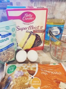 Then, after mixing my cake mix, eggs, and oil for a few minutes, I added my walnuts and butterscotch chips and mixed for just about 20-30 seconds so they were evenly dispersed.