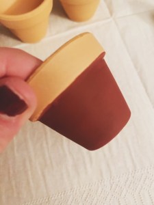 Using the larger of my two sponge brushes, I swept on the red paint onto the bottom of the terracotta pots. The paint should go all the way up to the rim under the top, as pictured below.