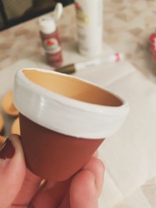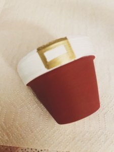 Then, once that craft paint has dried (and if you’re doing several of these, the first will likely be dry by the time you finish the red paint on the last), you’re going to get cracking with your white paint. I used my smaller sponge brush to paint on the unpainted rim. This should essentially make a belt for “Santa!”