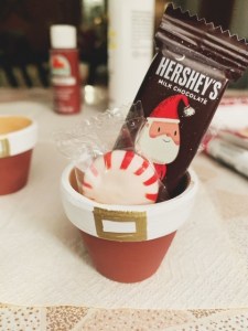 After all of your terra cotta pots dry, you can begin filling them with your treats! This year, since my terra cotta pots are small, I decided to use peppermints and mini Hershey Santas in each pot. I think my work team members are going to love this little festive Christmas treat this year!