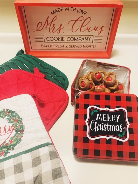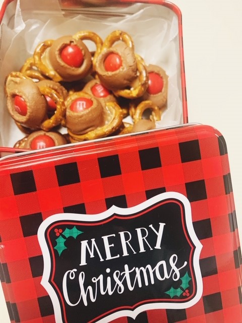 Here’s a hint: instead of square pretzels, I use the traditional pretzels and ONLY red M&Ms to make my candies look like little reindeer!