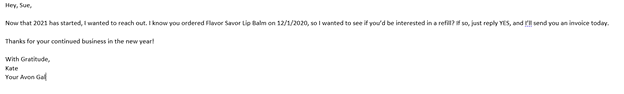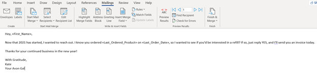 For this example, let’s pretend I am using mail merges for my Avon business. My excel spreadsheet might have columns for first name, last name, email, last date of order, and last ordered product.