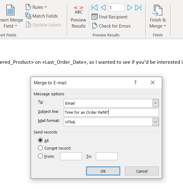 When it’s all ready and you’re pleased with the email, go to “Finish & Merge” and then make sure that your column header for email appears in the “to” section. Also, you can write your unique subject line in that field.