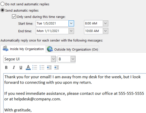 Here’s the step-by-step: In Outlook, simply click “File” in the top left corner. Then select “Automatic Replies,” which should be right under “Account Settings.” Click “send automatic replies” and select your time range. This is my biggest tip in this area: give yourself at least TWO HOURS after you return to work for your auto reply to turn off. That means if you are back in on Monday at 8 AM, select 10 AM. These two hours will let you check your inbox, respond to anything urgent, and prioritize the resto f your catch-up tasks before you start having to reply at your usual in-office response rate.