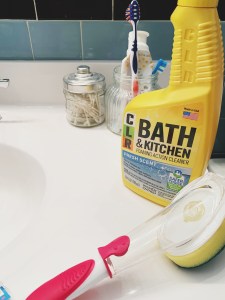 To clean this shower flooring to the best of my ability, it takes some elbow grease. I’ve found that using a $1 Soap Dispensing Brush with a sponge head can really work! I spray a few sprays of foaming bathroom cleaner and using the sink to add a little cold water. Then I just scrub away!