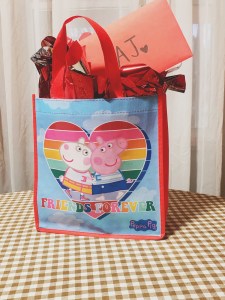 In this section of the store, I found the cutest reusable tote bag – Peppa Pig with a multicolored heart! My little boy loves Peppa Pig (though I think it’s a really odd little show), and this one works well for Valentine’s Day, but also looks traditional enough to be carried or used at other times as well.
