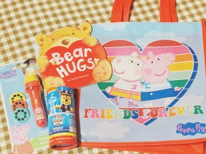 I also found a board book called “Bear Hugs,” a Paw Patrol puzzle in a small cardboard tube (and we’re really in a big puzzle phase right now), and a Peppa Pig projection flashlight. The puzzle, bag, and flashlight all came in various characters in case your little one prefers other shows and themes.