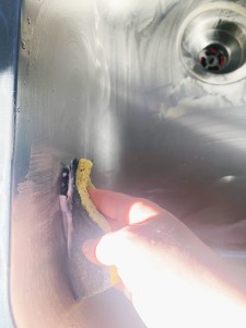 #3: Using your sponge, begin scrubbing the sink bottom. You’ll need to use some elbow grease with the scrubby-side of your sponge, but it should pull up any staining or discoloration. Check out this picture and video to see what I mean!