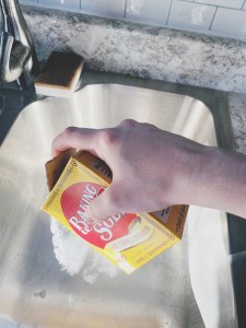 #1: Sprinkle the baking soda in your dirty sink. (I do take anything solid out – so if you had a noodle left or a piece of leftover celery or something, remove anything tangible first and quickly rinse out the sink.)