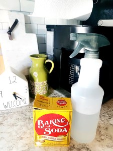 #2: Spray your mixture over the baking soda layer until it’s lightly damp. Let this sit for a few minutes – maybe check the mail or empty the dishwasher or something while it sits for a bit.