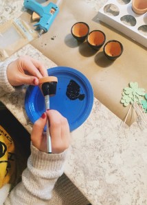 First, you’re going to paint your mini pots black on the outside. This doesn’t take a ton of skill and it can be a little messy on the rim of the pot and even on the bottom – you simply want it to look like a leprechaun’s black pot.
