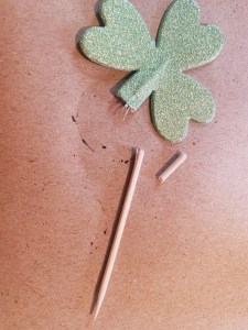 Next, if you bought cupcake picks like I did, you’ll need to break off the wooden stems. If you found some clover stickers or foam, you’ll skip that step, of course.